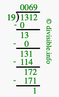 The image displays 69 at the top, which is the quotient, and 1 at the bottom, which is the remainder. Therefore, the answer to 1312 divided by 19 (1312 ÷ 19) using long division is 69 remainder 1, or simply 69 R 1.