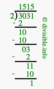 The image displays 1515 at the top, which is the quotient, and 1 at the bottom, which is the remainder. Therefore, the answer to 3031 divided by 2 (3031 ÷ 2) using long division is 1515 remainder 1, or simply 1515 R 1.