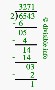 The image displays 3271 at the top, which is the quotient, and 1 at the bottom, which is the remainder. Therefore, the answer to 6543 divided by 2 (6543 ÷ 2) using long division is 3271 remainder 1, or simply 3271 R 1.