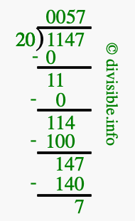 The image displays 57 at the top, which is the quotient, and 7 at the bottom, which is the remainder. Therefore, the answer to 1147 divided by 20 (1147 ÷ 20) using long division is 57 remainder 7, or simply 57 R 7.