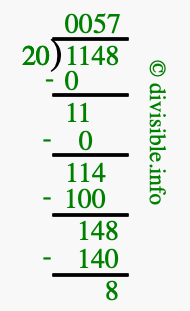 The image displays 57 at the top, which is the quotient, and 8 at the bottom, which is the remainder. Therefore, the answer to 1148 divided by 20 (1148 ÷ 20) using long division is 57 remainder 8, or simply 57 R 8.