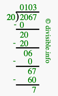 The image displays 103 at the top, which is the quotient, and 7 at the bottom, which is the remainder. Therefore, the answer to 2067 divided by 20 (2067 ÷ 20) using long division is 103 remainder 7, or simply 103 R 7.