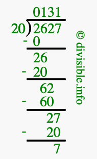 Here we will show you an image that illustrates how to calculate 2627 divided by 20 using long division. We will also give you the answer to 2627 divided by 20 (2627 ÷ 20) as a fraction and as a decimal.