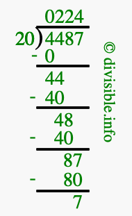 The image displays 224 at the top, which is the quotient, and 7 at the bottom, which is the remainder. Therefore, the answer to 4487 divided by 20 (4487 ÷ 20) using long division is 224 remainder 7, or simply 224 R 7.