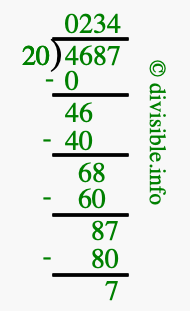 The image displays 234 at the top, which is the quotient, and 7 at the bottom, which is the remainder. Therefore, the answer to 4687 divided by 20 (4687 ÷ 20) using long division is 234 remainder 7, or simply 234 R 7.