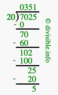 The image displays 351 at the top, which is the quotient, and 5 at the bottom, which is the remainder. Therefore, the answer to 7025 divided by 20 (7025 ÷ 20) using long division is 351 remainder 5, or simply 351 R 5.