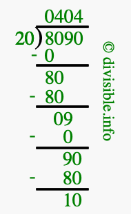 The image displays 404 at the top, which is the quotient, and 10 at the bottom, which is the remainder. Therefore, the answer to 8090 divided by 20 (8090 ÷ 20) using long division is 404 remainder 10, or simply 404 R 10.