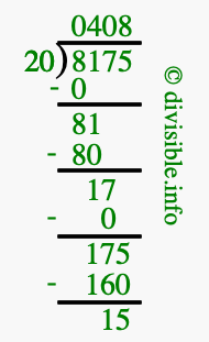 Here we will show you an image that illustrates how to calculate 8175 divided by 20 using long division. We will also give you the answer to 8175 divided by 20 (8175 ÷ 20) as a fraction and as a decimal.