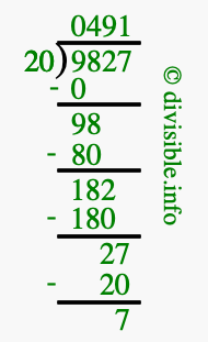 The image displays 491 at the top, which is the quotient, and 7 at the bottom, which is the remainder. Therefore, the answer to 9827 divided by 20 (9827 ÷ 20) using long division is 491 remainder 7, or simply 491 R 7.