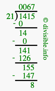 The image displays 67 at the top, which is the quotient, and 8 at the bottom, which is the remainder. Therefore, the answer to 1415 divided by 21 (1415 ÷ 21) using long division is 67 remainder 8, or simply 67 R 8.