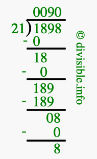 The image displays 90 at the top, which is the quotient, and 8 at the bottom, which is the remainder. Therefore, the answer to 1898 divided by 21 (1898 ÷ 21) using long division is 90 remainder 8, or simply 90 R 8.