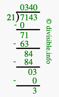 Here we will show you an image that illustrates how to calculate 7143 divided by 21 using long division. We will also give you the answer to 7143 divided by 21 (7143 ÷ 21) as a fraction and as a decimal.