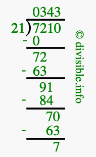 Here we will show you an image that illustrates how to calculate 7210 divided by 21 using long division. We will also give you the answer to 7210 divided by 21 (7210 ÷ 21) as a fraction and as a decimal.
