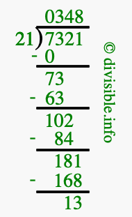 The image displays 348 at the top, which is the quotient, and 13 at the bottom, which is the remainder. Therefore, the answer to 7321 divided by 21 (7321 ÷ 21) using long division is 348 remainder 13, or simply 348 R 13.