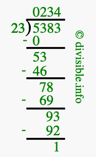 The image displays 234 at the top, which is the quotient, and 1 at the bottom, which is the remainder. Therefore, the answer to 5383 divided by 23 (5383 ÷ 23) using long division is 234 remainder 1, or simply 234 R 1.