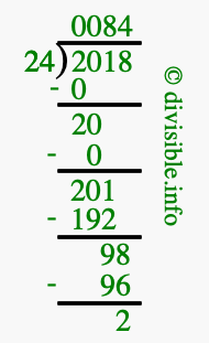 Here we will show you an image that illustrates how to calculate 2018 divided by 24 using long division. We will also give you the answer to 2018 divided by 24 (2018 ÷ 24) as a fraction and as a decimal.