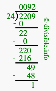 The image displays 92 at the top, which is the quotient, and 1 at the bottom, which is the remainder. Therefore, the answer to 2209 divided by 24 (2209 ÷ 24) using long division is 92 remainder 1, or simply 92 R 1.