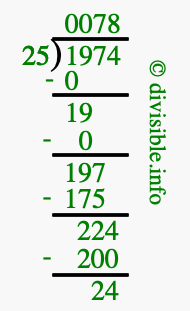 The image displays 78 at the top, which is the quotient, and 24 at the bottom, which is the remainder. Therefore, the answer to 1974 divided by 25 (1974 ÷ 25) using long division is 78 remainder 24, or simply 78 R 24.