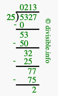 The image displays 213 at the top, which is the quotient, and 2 at the bottom, which is the remainder. Therefore, the answer to 5327 divided by 25 (5327 ÷ 25) using long division is 213 remainder 2, or simply 213 R 2.
