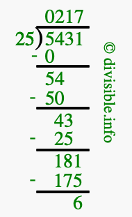 The image displays 217 at the top, which is the quotient, and 6 at the bottom, which is the remainder. Therefore, the answer to 5431 divided by 25 (5431 ÷ 25) using long division is 217 remainder 6, or simply 217 R 6.