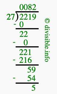 The image displays 82 at the top, which is the quotient, and 5 at the bottom, which is the remainder. Therefore, the answer to 2219 divided by 27 (2219 ÷ 27) using long division is 82 remainder 5, or simply 82 R 5.