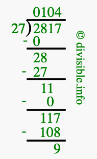 The image displays 104 at the top, which is the quotient, and 9 at the bottom, which is the remainder. Therefore, the answer to 2817 divided by 27 (2817 ÷ 27) using long division is 104 remainder 9, or simply 104 R 9.