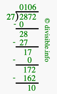 The image displays 106 at the top, which is the quotient, and 10 at the bottom, which is the remainder. Therefore, the answer to 2872 divided by 27 (2872 ÷ 27) using long division is 106 remainder 10, or simply 106 R 10.