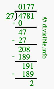The image displays 177 at the top, which is the quotient, and 2 at the bottom, which is the remainder. Therefore, the answer to 4781 divided by 27 (4781 ÷ 27) using long division is 177 remainder 2, or simply 177 R 2.