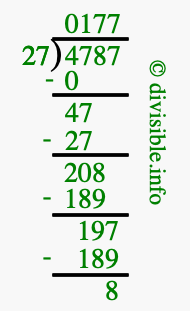 The image displays 177 at the top, which is the quotient, and 8 at the bottom, which is the remainder. Therefore, the answer to 4787 divided by 27 (4787 ÷ 27) using long division is 177 remainder 8, or simply 177 R 8.