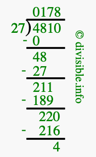 Here we will show you an image that illustrates how to calculate 4810 divided by 27 using long division. We will also give you the answer to 4810 divided by 27 (4810 ÷ 27) as a fraction and as a decimal.