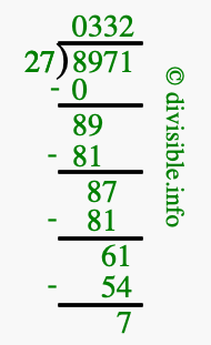 The image displays 332 at the top, which is the quotient, and 7 at the bottom, which is the remainder. Therefore, the answer to 8971 divided by 27 (8971 ÷ 27) using long division is 332 remainder 7, or simply 332 R 7.
