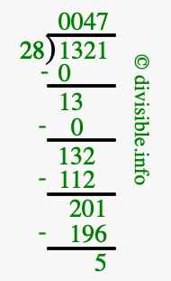 The image displays 47 at the top, which is the quotient, and 5 at the bottom, which is the remainder. Therefore, the answer to 1321 divided by 28 (1321 ÷ 28) using long division is 47 remainder 5, or simply 47 R 5.