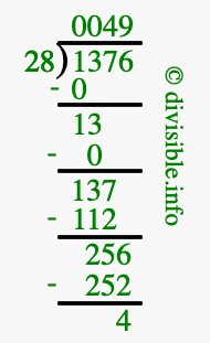 Here we will show you an image that illustrates how to calculate 1376 divided by 28 using long division. We will also give you the answer to 1376 divided by 28 (1376 ÷ 28) as a fraction and as a decimal.