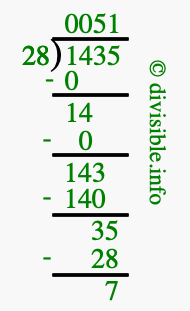 The image displays 51 at the top, which is the quotient, and 7 at the bottom, which is the remainder. Therefore, the answer to 1435 divided by 28 (1435 ÷ 28) using long division is 51 remainder 7, or simply 51 R 7.