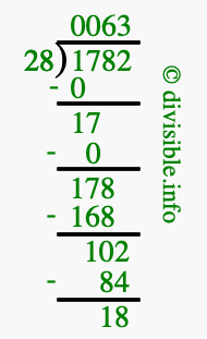 Here we will show you an image that illustrates how to calculate 1782 divided by 28 using long division. We will also give you the answer to 1782 divided by 28 (1782 ÷ 28) as a fraction and as a decimal.