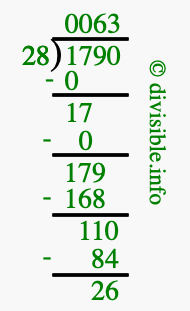 The image displays 63 at the top, which is the quotient, and 26 at the bottom, which is the remainder. Therefore, the answer to 1790 divided by 28 (1790 ÷ 28) using long division is 63 remainder 26, or simply 63 R 26.