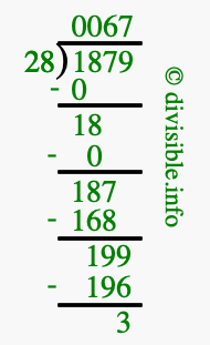 The image displays 67 at the top, which is the quotient, and 3 at the bottom, which is the remainder. Therefore, the answer to 1879 divided by 28 (1879 ÷ 28) using long division is 67 remainder 3, or simply 67 R 3.