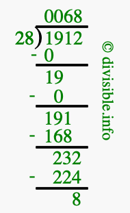 Here we will show you an image that illustrates how to calculate 1912 divided by 28 using long division. We will also give you the answer to 1912 divided by 28 (1912 ÷ 28) as a fraction and as a decimal.
