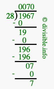 The image displays 70 at the top, which is the quotient, and 7 at the bottom, which is the remainder. Therefore, the answer to 1967 divided by 28 (1967 ÷ 28) using long division is 70 remainder 7, or simply 70 R 7.