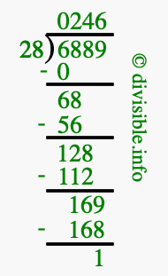 The image displays 246 at the top, which is the quotient, and 1 at the bottom, which is the remainder. Therefore, the answer to 6889 divided by 28 (6889 ÷ 28) using long division is 246 remainder 1, or simply 246 R 1.