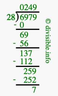The illustration below shows you how to calculate 6979 divided by 28 using long division. As you can see, the dividend value of 6979 is located to the right of the "⟌" and the divisor value of 28 is located to the left of the "⟌".