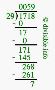 The image displays 59 at the top, which is the quotient, and 7 at the bottom, which is the remainder. Therefore, the answer to 1718 divided by 29 (1718 ÷ 29) using long division is 59 remainder 7, or simply 59 R 7.