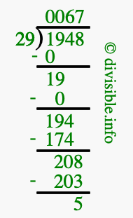 The image displays 67 at the top, which is the quotient, and 5 at the bottom, which is the remainder. Therefore, the answer to 1948 divided by 29 (1948 ÷ 29) using long division is 67 remainder 5, or simply 67 R 5.