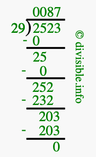 Here we will show you an image that illustrates how to calculate 2523 divided by 29 using long division. We will also give you the answer to 2523 divided by 29 (2523 ÷ 29) as a fraction and as a decimal.