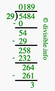 Here we will show you an image that illustrates how to calculate 5484 divided by 29 using long division. We will also give you the answer to 5484 divided by 29 (5484 ÷ 29) as a fraction and as a decimal.