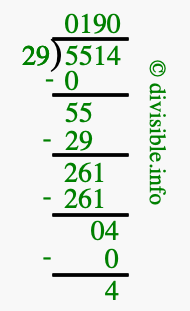 The image displays 190 at the top, which is the quotient, and 4 at the bottom, which is the remainder. Therefore, the answer to 5514 divided by 29 (5514 ÷ 29) using long division is 190 remainder 4, or simply 190 R 4.