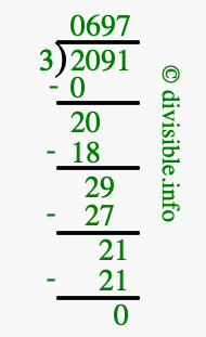 The image displays 697 at the top, which is the quotient, and 0 at the bottom, which is the remainder. Therefore, the answer to 2091 divided by 3 (2091 ÷ 3) using long division is 697 remainder 0, or simply 697 R 0.