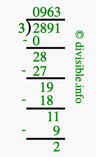 The image displays 963 at the top, which is the quotient, and 2 at the bottom, which is the remainder. Therefore, the answer to 2891 divided by 3 (2891 ÷ 3) using long division is 963 remainder 2, or simply 963 R 2.