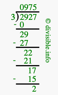 The image displays 975 at the top, which is the quotient, and 2 at the bottom, which is the remainder. Therefore, the answer to 2927 divided by 3 (2927 ÷ 3) using long division is 975 remainder 2, or simply 975 R 2.