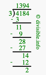 Here we will show you an image that illustrates how to calculate 4184 divided by 3 using long division. We will also give you the answer to 4184 divided by 3 (4184 ÷ 3) as a fraction and as a decimal.